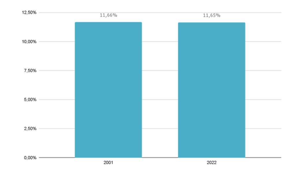 Gráfico 4. Porcentaje de la matrícula de género femenina en la secundaria de la Educación para Jóvenes y Adultos. Años 2001 y 2022.