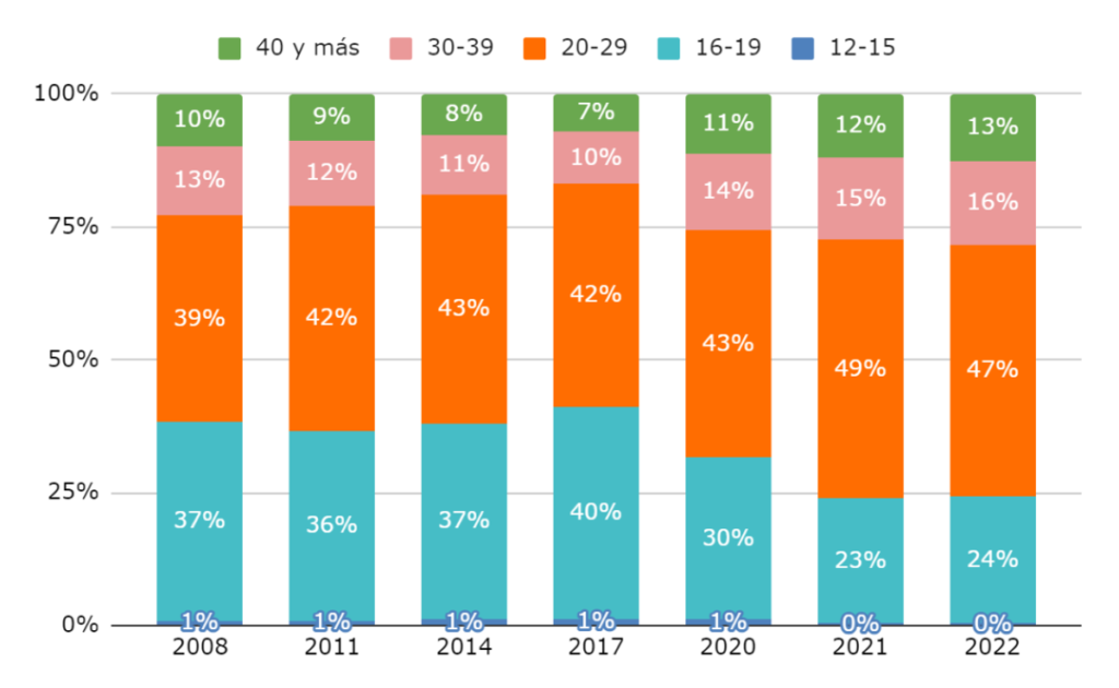 Gráfico 3. Porcentaje del total de la matrícula de secundaria de Educación para Jóvenes y Adultos por franja etaria. Entre 2008 y 2022.