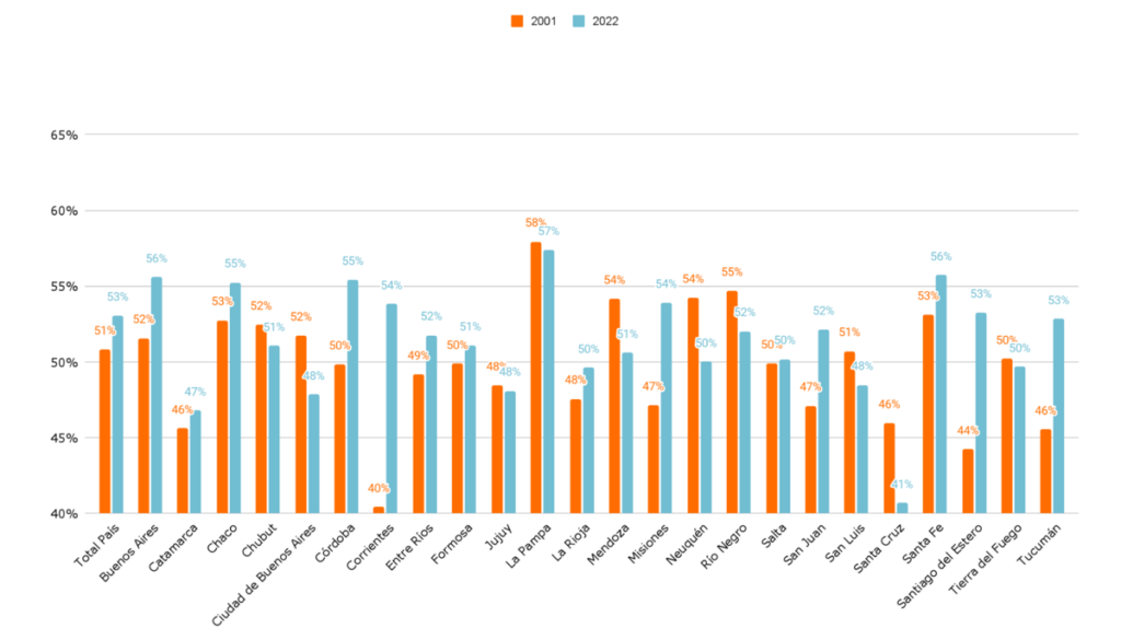 Las provincias donde más creció la matrícula de jóvenes y adultos entre 2001 y 2022 fueron Jujuy (652%), Corrientes (554%), San Luis (444%), Chaco (259%) y Formosa (111%). Los jóvenes y adultos representan el 12% de la matrícula de la escuela secundaria a nivel nacional; esta proporción se ha mantenido constante en los últimos 20 años. Se ubican por encima del promedio nacional las provincias de Santa Cruz (21%), Neuquén (19%), Tierra del Fuego (17%), Mendoza (16%) y la Ciudad Autónoma de Buenos Aires (15%).