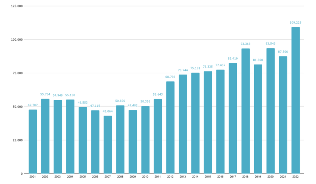 La matrícula de egresados bajo esta modalidad se duplicó entre 2001 y 2022. El aumento fue del 128% en los últimos 20 años. La mayoría de quienes terminan de forma extendida son menores de 29 años. Las provincias donde más creció la graduación son Chaco, Jujuy, San Luis, Corrientes y Salta.