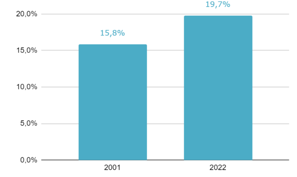 Entre 2001 y 2022, la cantidad de egresados de las escuelas secundarias para jóvenes y adultos creció un 128%. Uno de cada cinco egresados (19,7%), 4 puntos porcentuales más que en 2001, termina la escuela en esta modalidad, que recibe a quienes no concluyeron la escuela común. La matrícula de jóvenes y adultos creció un 12%, acompañando la expansión de este nivel educativo en todo el país.